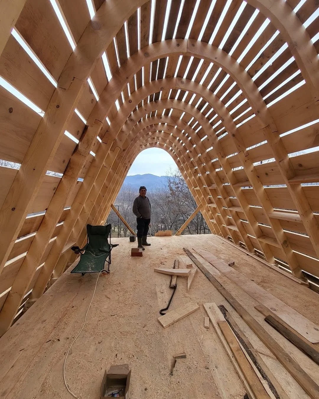 Fotografiile din timpul șantierului surprind expresia brută a lemnului masiv, forma sa poetică și modul în care lumina pătrunde printre nervurile structurii — un spațiu care respiră și transmite o emoție primară, aproape arhetipală.