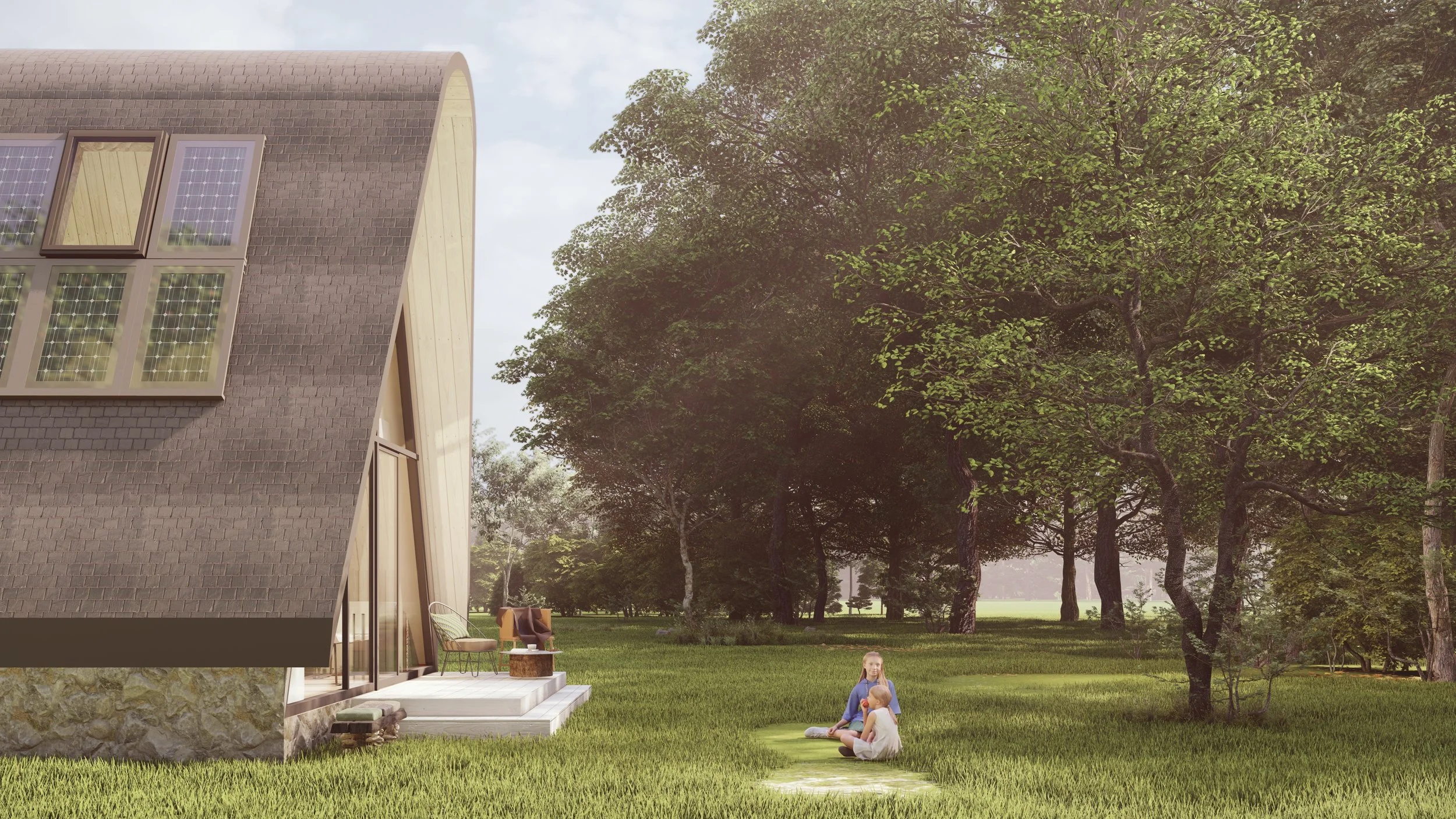 Forma în arc a acoperișului devine elementul identitar al cabanei – un gest arhitectural simplu, dar plin de forță, care oferă atât protecție, cât și continuitate între interior și exterior.