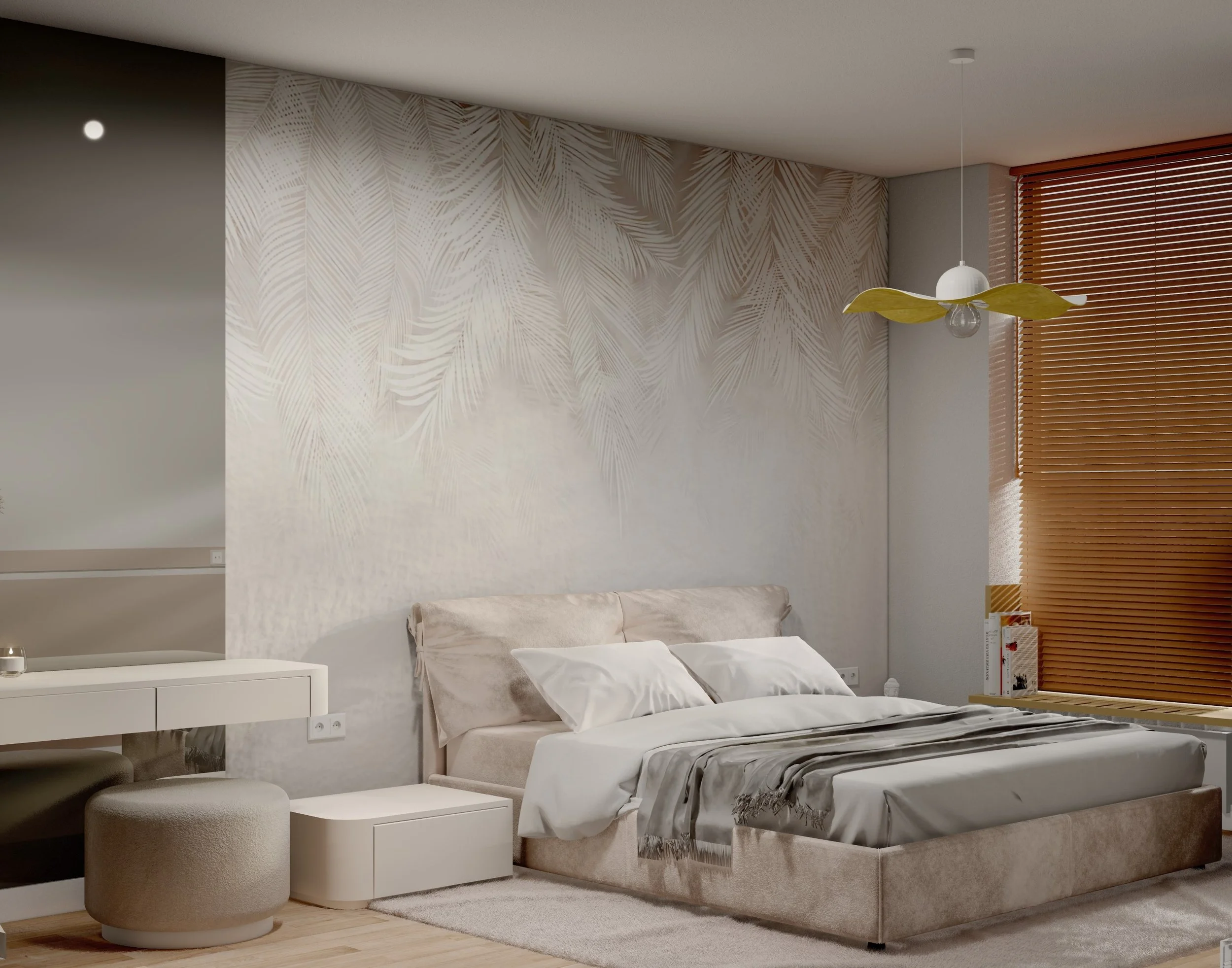 Paleta dominată de tonuri neutre, bejuri calde și accente sidefate creează o atmosferă de intimitate naturală, unde fiecare detaliu respiră echilibru și delicatețe.