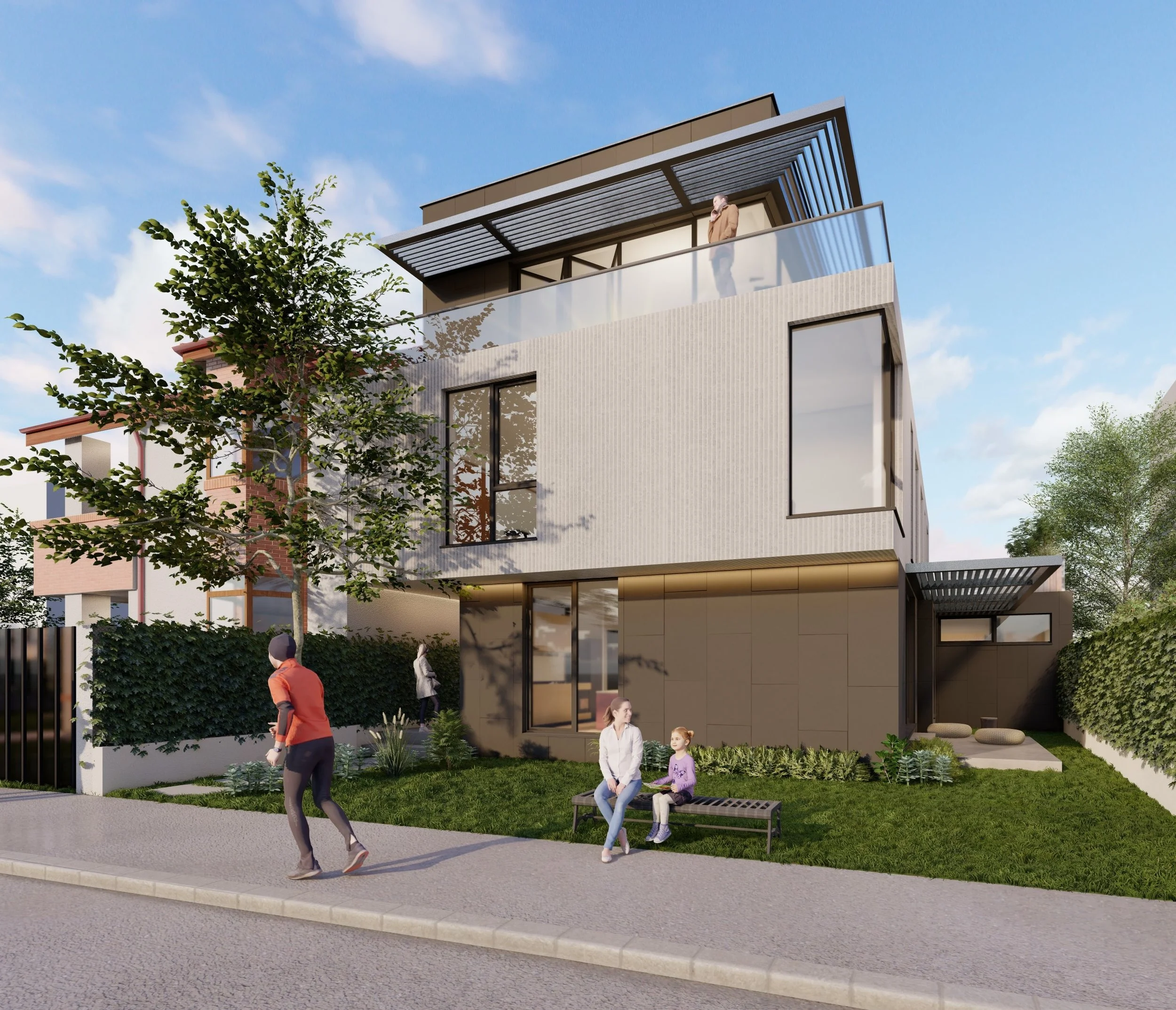 Proiectul propune o clădire contemporană cu două unități locative, dezvoltate pe regim P+2, unde proporția, lumina și materialitatea definesc identitatea ansamblului.