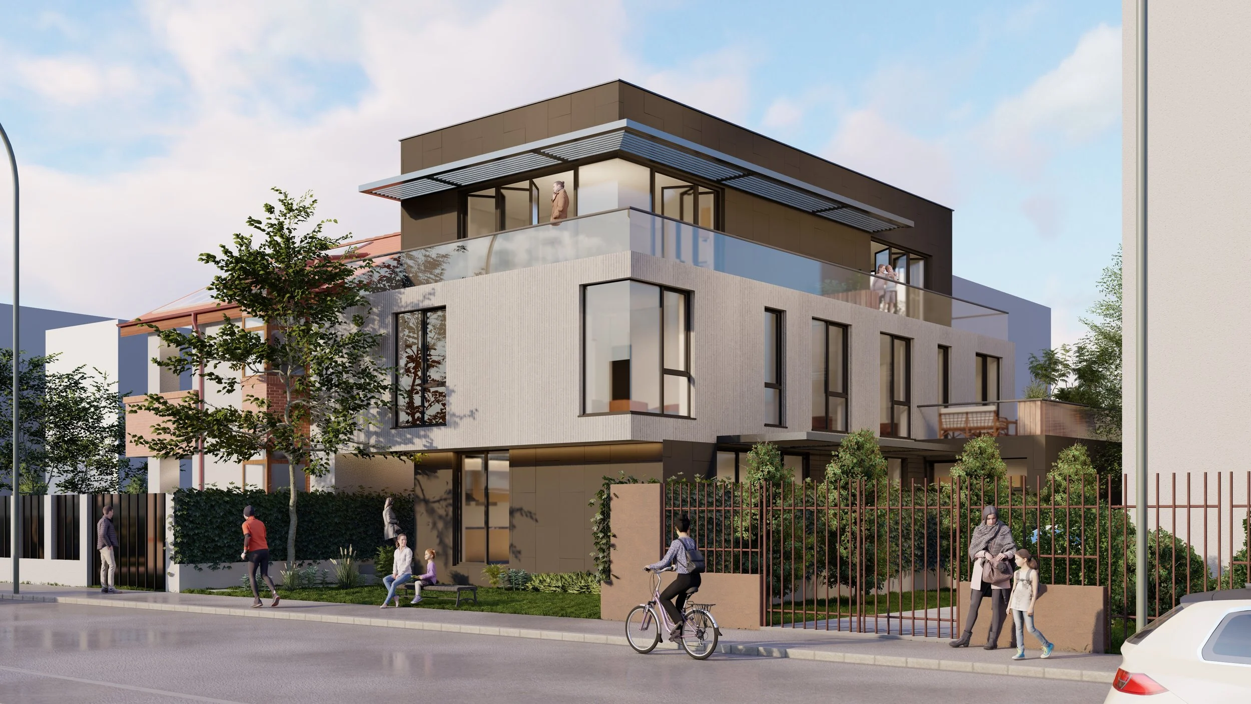 Clădire contemporană cu două unități locative. Designul urmărește simplitatea elegantă și integrarea armonioasă în contextul urban.